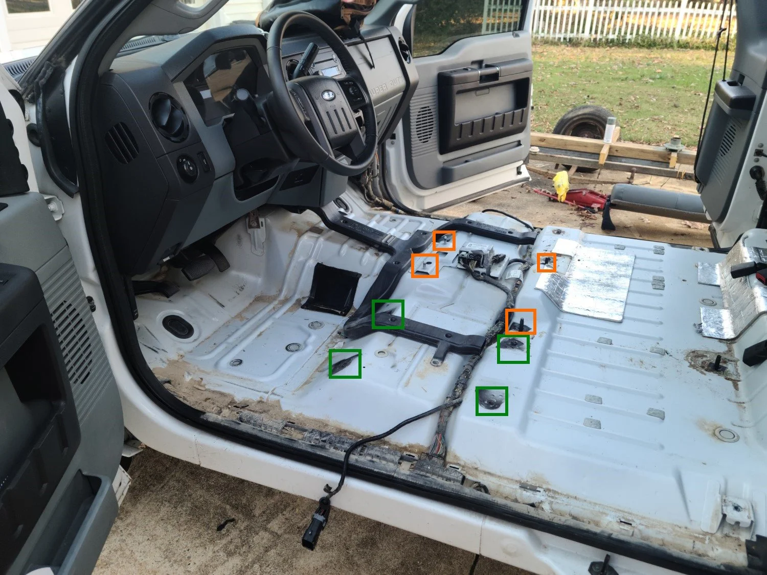 In the above photo, you can see the green boxes are where the drivers seat bolts through the cab, and the orange shows the 4 standoffs for the middle jump seat / flow through console mounting points.