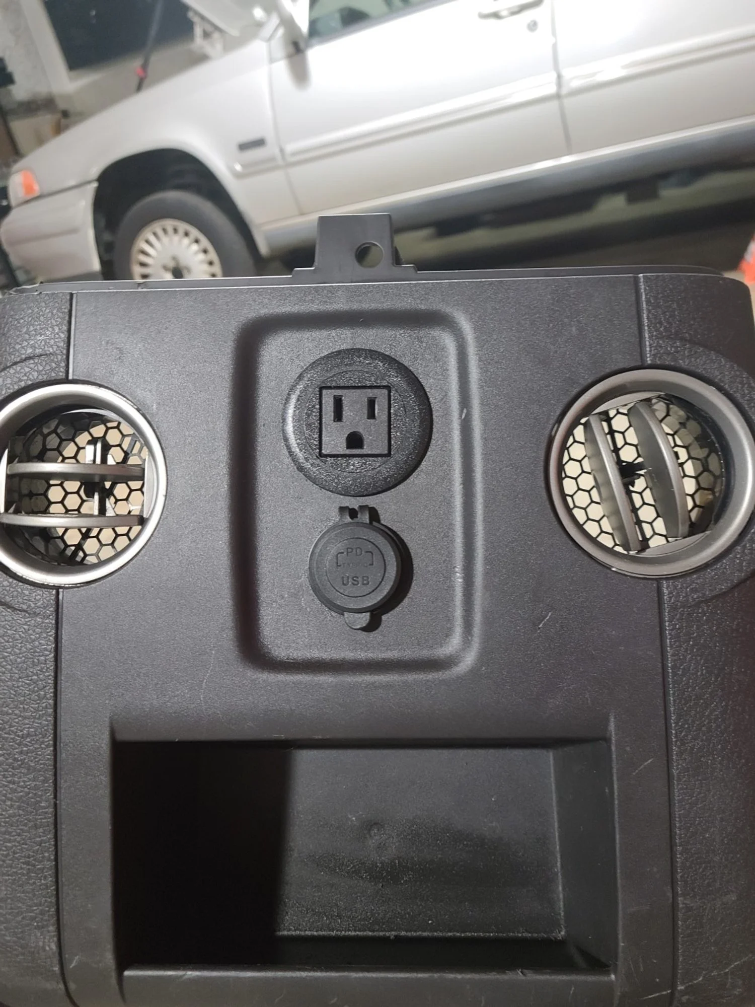 From the factory, the flow through console has 3 additional power ports installed. 1 110V inverter outlet, and 2 standard 12v lighter sockets. On higher trim trucks, there is a harness under the carpet that runs to single plug on the side of the console to give these ports power. However on a XL trim truck, such harness is not there. Additionally the inverter needs a CANBUS signal to turn on and off, which can be a pain when trying to integrate the OEM inverter. For this project, I ended up buying a basic inverter off Amazon, which had the same 150W output as the stock inverter. (Its worth noting this is a very small amount of wattage, and a much beefier inverter could be easily fit into the large space of the center console for powering high wattage power tools).